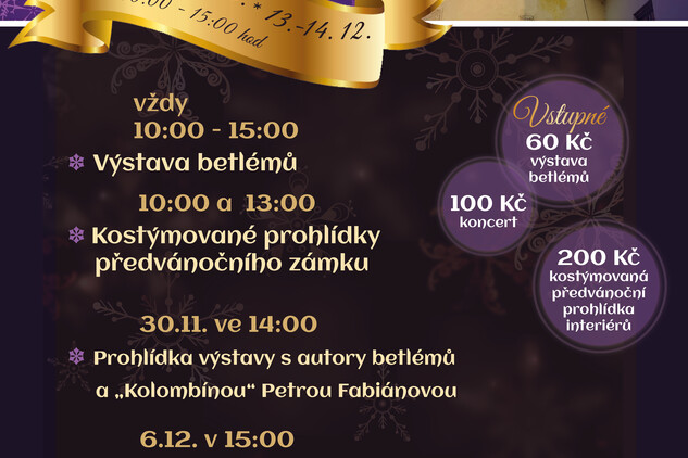 Výstava betlémů bude otevřena vždy od 10:00 do 15:00, ale formálně ji zahájíme 30.11. ve 14:00 za přítomnosti některých autorů, „Kolombíny“ Petry Fabiánové, tanečnic Angel’s Tribe a zpívajících dětí. Komentované prohlídky betlémů budou začínat jednotlivé dny v 10:00, 11:00, 12:00, 13:00 a 14:00.